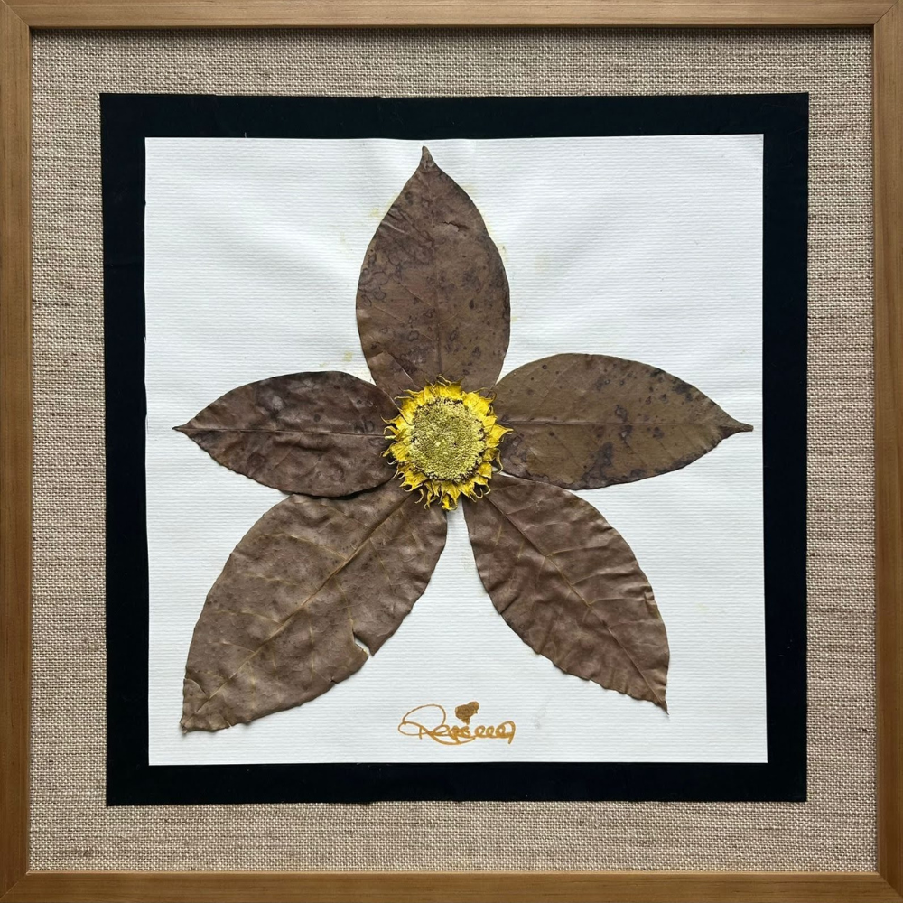 Técnica: Colagem de Folha de Ipê-Rosa (Tabebuia) e Girassol (Helianthus) sobre papel cartão reciclado